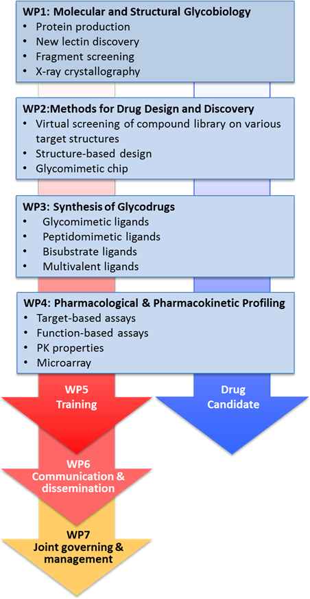 The expertise for glycodrug discovery already exists throughout Europe, but is rather dispersed in various European academic institutions and small drug discovery enterprises. To bridge this gap and to create a large force in the glycodrug development, we have designed a joint PhD training and research programme that involves all phases of the glycodrug design and development pipeline preceding in vivo studies and clinical trials. Our consortium has the goal at the research level to make the compelling scientific point that glycodrugs can and need to be developed and at a human resource level that newly minted scientists from the project will make a difference and will pursue the glycodrug opportunities. The drug pipeline is covered from target identification to ADMET. The PhD4GlycoDrug Consortium will lead to a lasting innovative force in glycodrug development and continue to show big pharmaceutical companies its potential.